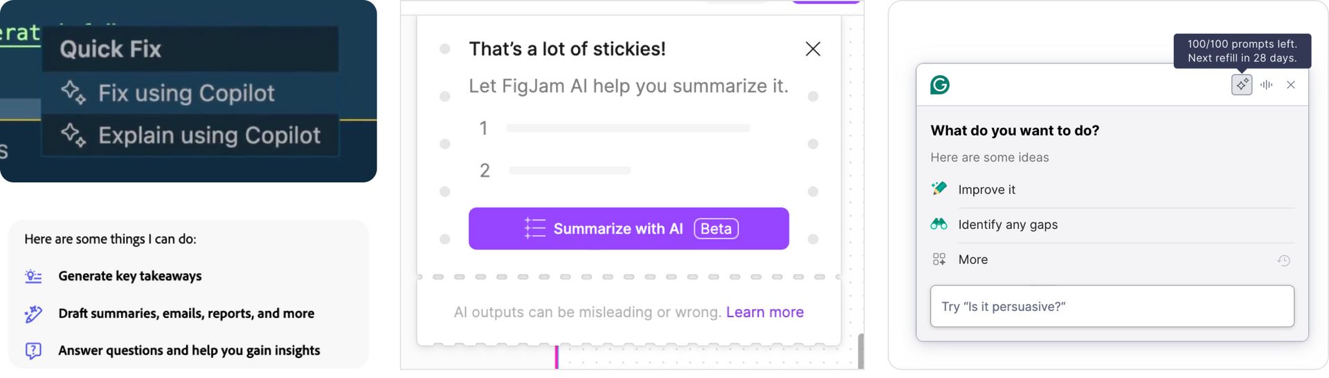 In-app clues - Open chat experiences give users full control but can create anxiety about where to begin. GitHub Copilot's "Quick Fix" suggestions and Figma's contextual AI prompts show users what's possible without overwhelming them.