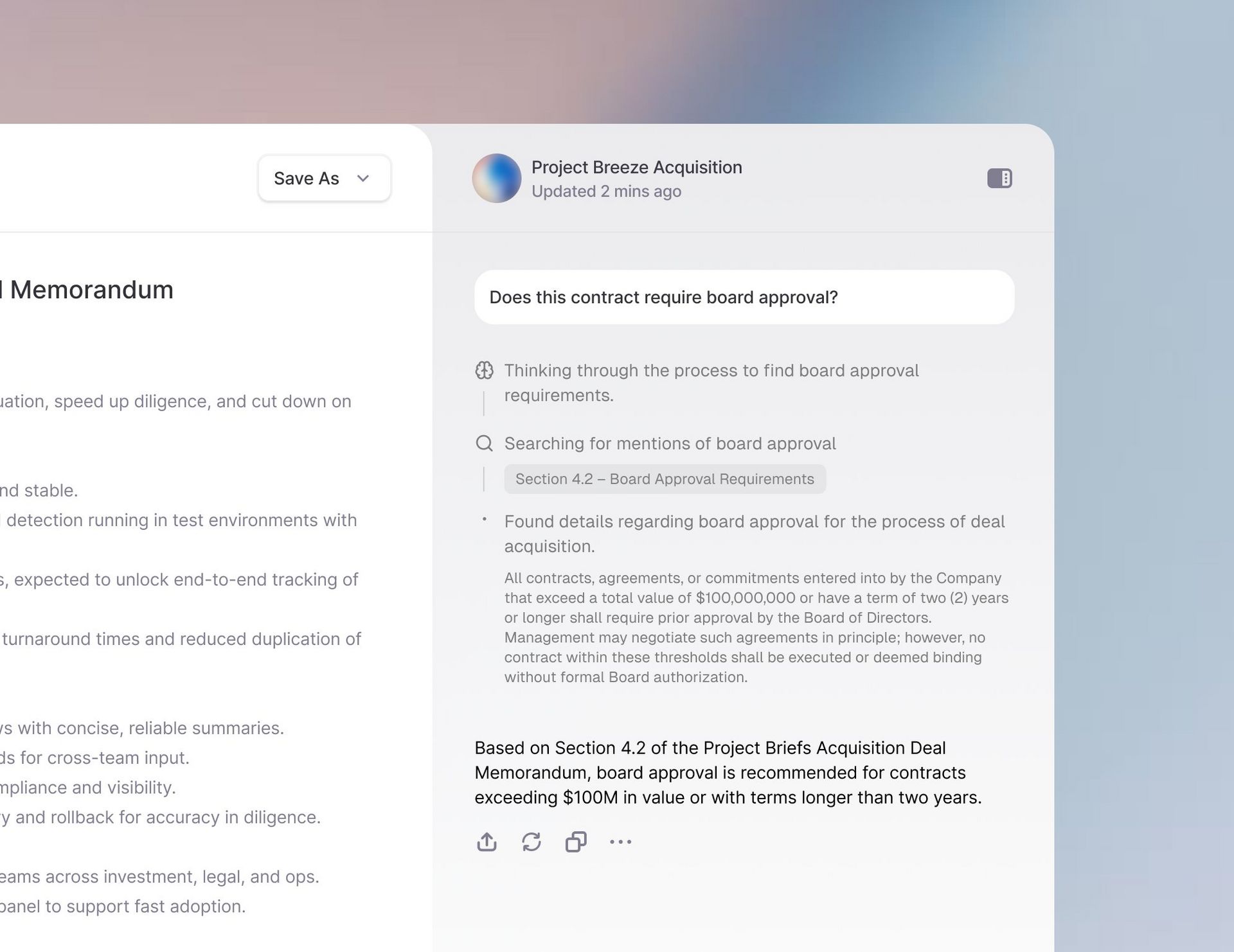At Turbo, we designed an M&A due diligence tool where users ask complex questions about acquisition documents. Instead of just returning an answer, we show the footprints: